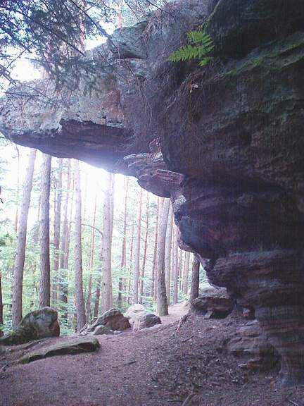Hier überqueren wir die Straße und kommen zum Nordwestteil des Felsenweges. Zunächst geht es auf breiterem Weg (Plapperzeit!), dann wieder auf Pfaden am Zigeunerfels, Maibrunnenfelsen und Kanzelfelsen vorbei. In einer großen Schleife umgehen wir das Lindersbachtal mit den Rodalber Sportanlagen, überqueren die zum Höhendorf Clausen führende Straße und kommen zum für große Besucherzahlen ausgelegten Hilschberghaus. Fast durchgängig auf Pfaden wandern wir am Saufelsen und am Rappenkopffelsen vorbei (unter uns liegen die Ortsteile Lohn und Heide) und wenden uns dann nach Norden, um das größte Seitental, das Clauser Tal zu umrunden. Dies ist das stillste und ursprünglichste Teilstück des Weges; wir passieren dabei den Klausfelsen, den im Talschluss gelegenen mächtigen Kuhfelsen, das Eisenbörnchen und den Fuchsfelsen. Beim Wanderparkplatz Hirschbrunnen überschreiten wir die Rodalbe und gehen den langen Südostabschnitt des Felsenweges an. Am Ortsteil Neuhof entlang (wir wundern uns angesichts der vielen Wildschweinspuren, wie nahe das Schwarzwild an die Häuser herangeht) kommen wir aufsteigend zum Felsen am Hohen Kopf und zur filmreifen Kulisse des Karl-May-Felsens. Der Pfad umgeht das Hungerpfuhltal und das Gemerstal und erreicht am Geißbühlkopf einen der seltenen Aussichtpunkte. Der Seibelsbachfelsen und die Sommerwaldquelle über dem (nomen est omen) Langenbachtal sind die nächsten Stationen, bevor wir mit dem Bärenfelsen, der größten Sandsteinhöhle der Pfalz, einen würdigen letzten Höhepunkt erreichen. Wer Lust auf einen Tourenausklang im Tal hat, verlässt hier die F-Markierung, geht ein paar Schritte hinunter zum Kleinen Bärenfelsen und durch das Langental Richtung Rodalben. Vor den ersten Häusern links hinauf und wir finden wieder den Anschluss an den Felsenwanderweg. Den verlassen wir an der Pirmasenser Straße unterhalb des Bruderfelsens, um zum Bahnhof hinunter zu schlendern. Variante: