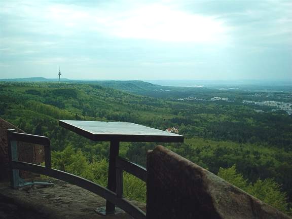 Vor uns das Kaiserslauterer Becken, ganz im Norden der Hunsrück, im Nordosten