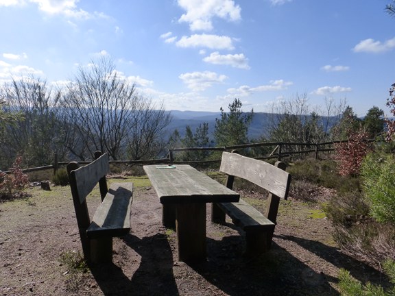 knorrigen Eiche mit Ruhebank führt links bergab.