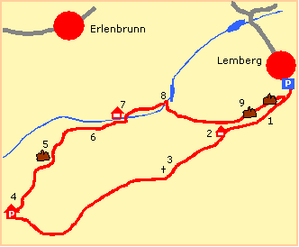 Sportplatz Lemberg 1 Rothenberg-Felsenpfad 2 Schutzhütte Schönhälschen 3 Keimskreuz 4 Waldhaus Drei Buchen 5 Felsenpfad 6 Rodalbtal 7 Moosbach-Schutzhütte 8 Fischweiher 9 Rothenberg (Aussichtspunkt) Sportplatz Lemberg