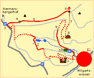 Parkplatz vor der Falkenburghalle 1 Burgruine Falkenburg 2 Naturschutzgebiet Tiergarten 3 Kreisstraße 56 (Auffahrt zum Hermersbergerhof) 4 Höhenweg an der Tiergartenhalde 5 Aussichtspunkt Wasgaublick 6 Wegspinne mit Schutzhütte 7 Kurt-Reinhard-Pfad 8 Aussichtspunkt Deichenwand 9 Schulwald 10 Sportplatz Parkplatz