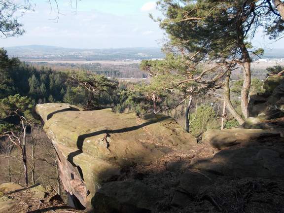 führt halbrechts ein Pfad auf den Heidenfelsen. Der bietet einen weiten Blick auf das Landstuhler