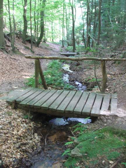 Wegpassage entlang des plätschernden Wolselbächleins, die durch einige Brückchen
