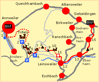 fünfzehn Minuten zur Reichsfeste Trifels hinauf, alle anderen gehen direkt