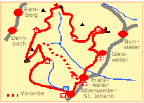 Landau-Saarbrücken, Bhf. Albersweiler und 1,5 km durch den Ort oder